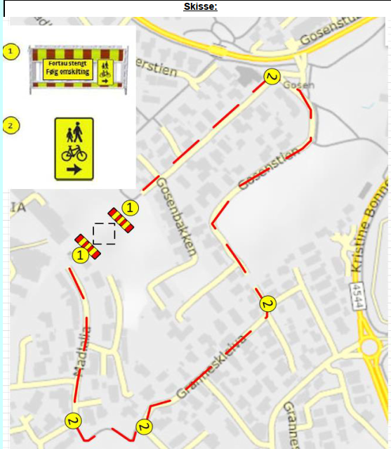 I forbindelse med påkobling av spillvannsledning i gangstien ved trafoen i Madlalia, må gangstien opp til Gosen stenges i en kort periode. Skilting vil bli satt ut i løpet av mandag 23.03.2026, og gangstien stenges tirsdag 24.03.2026 i løpet av formiddagen.